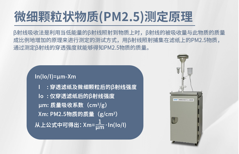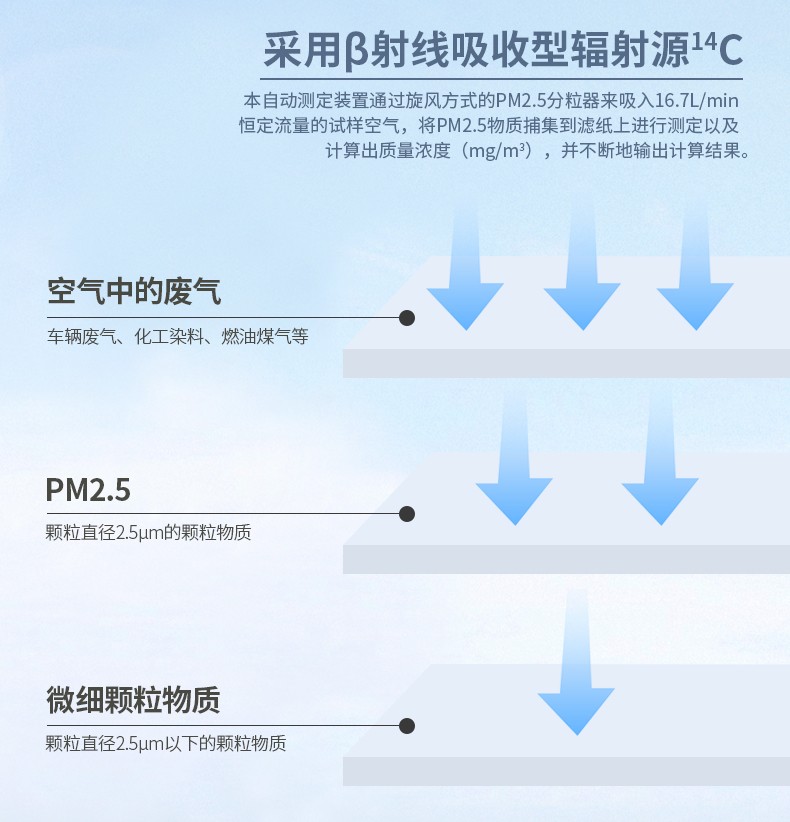 β射線吸收法是利用當(dāng)?shù)湍芰康摩律渚€照射到物質(zhì)上時(shí),β射線的被吸收量與此物質(zhì)的質(zhì)量成比例地增加的原理來(lái)進(jìn)行測(cè)定的測(cè)試方式,用β射線照射捕集在濾紙上的PM2.5物質(zhì),通過測(cè)定β射線的穿透強(qiáng)度就能夠得知PM2.5物質(zhì)的質(zhì)量。