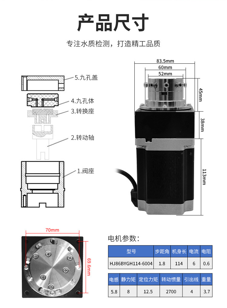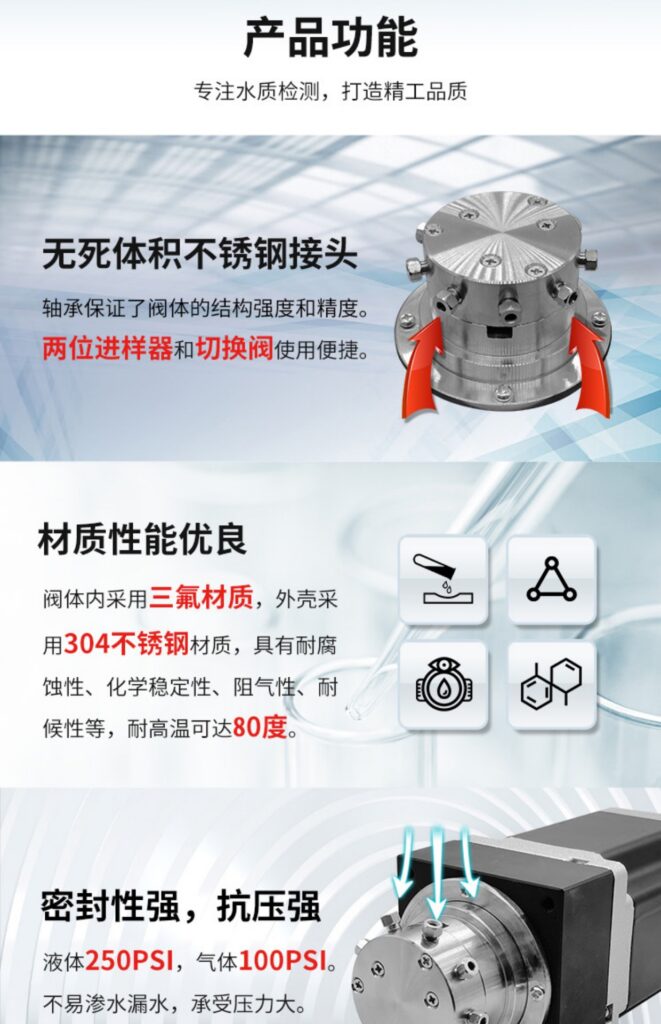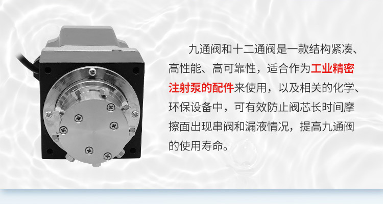 - 水質(zhì)九通閥十二通閥是一款結(jié)構(gòu)緊湊、高性能、高可靠性的閥門,是水質(zhì)在線監(jiān)測設(shè)備的配件,適合作為工業(yè)精密注射泵的配件來使用,以及相關(guān)的化學(xué)、環(huán)保設(shè)備中,可有效防止閥芯長時間摩擦面出現(xiàn)串閥和漏液情況,提高水質(zhì)九通閥的使用壽命。